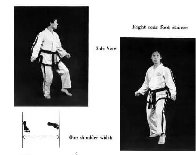 5.Llevar la mayor parte del peso del cuerpo hacia la pierna trasera.Cuando la pierna derecha está atrás se llama posición en pie de atrás derecha y viceversa. Siempre serealiza en enfrentamiento parcial tanto en ataque como en defensa. Asegurarse que la rodilla de la piernatrasera apunte hacia adentro